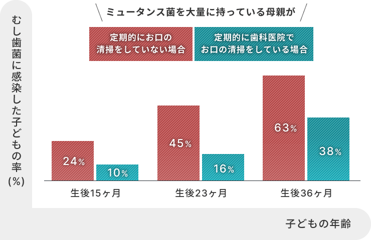 上のグラフは、お母さんのお口の中のばい菌 (ミュータンス菌) の数と、その子供たちのむし歯になる割合を示しています。お母さんのお口にばい菌が多いと子供もむし歯になる可能性が高くなるのが分かります。