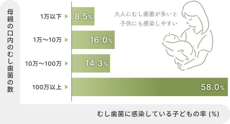 上のグラフは、お母さんのお口の中のばい菌 (ミュータンス菌) の数と、その子供たちのむし歯になる割合を示しています。お母さんのお口にばい菌が多いと子供もむし歯になる可能性が高くなるのが分かります。